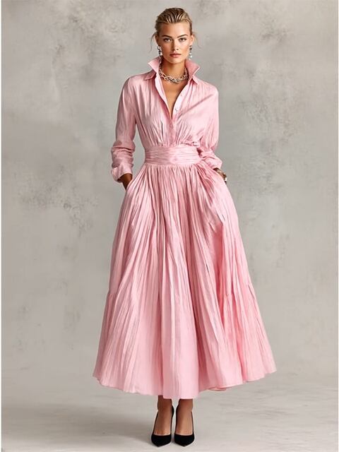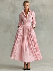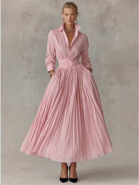 エレガント ロングドレス ウエストにフィット 秋冬 ピンク シャツドレス