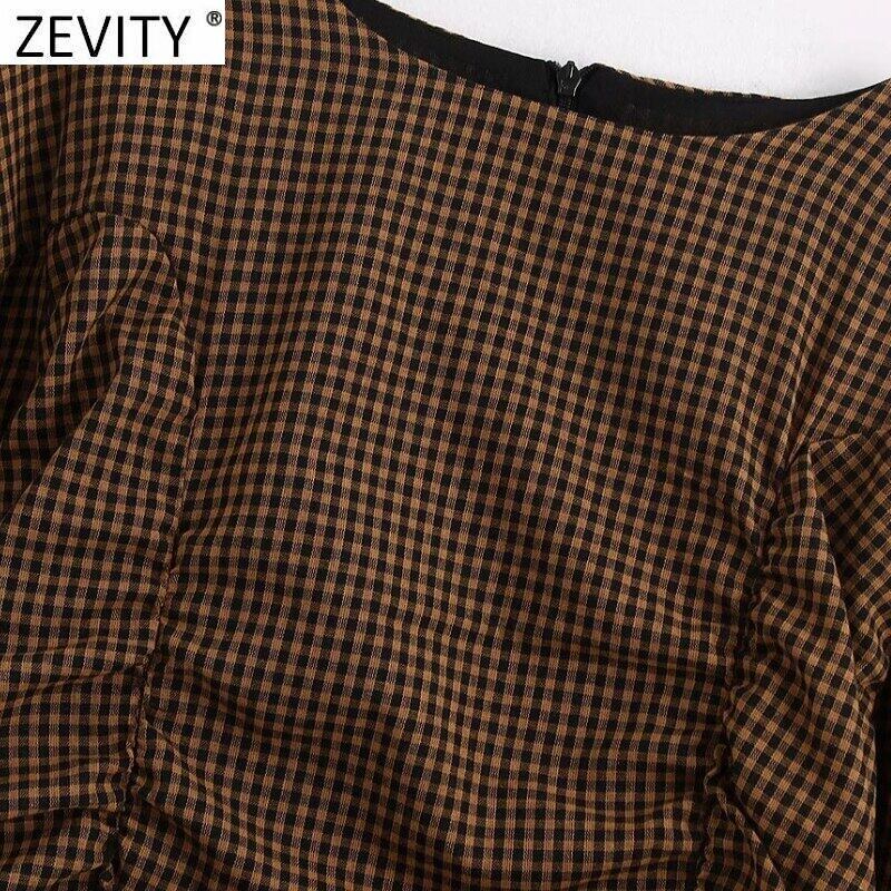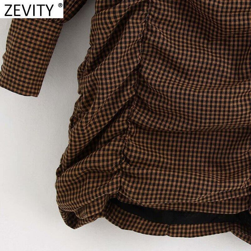 ZevityWomenヴィンテージチェック柄プリント伸縮性プリーツスリムミニドレスコートランタンスリーブバックジッパーシックな Amy99973563727