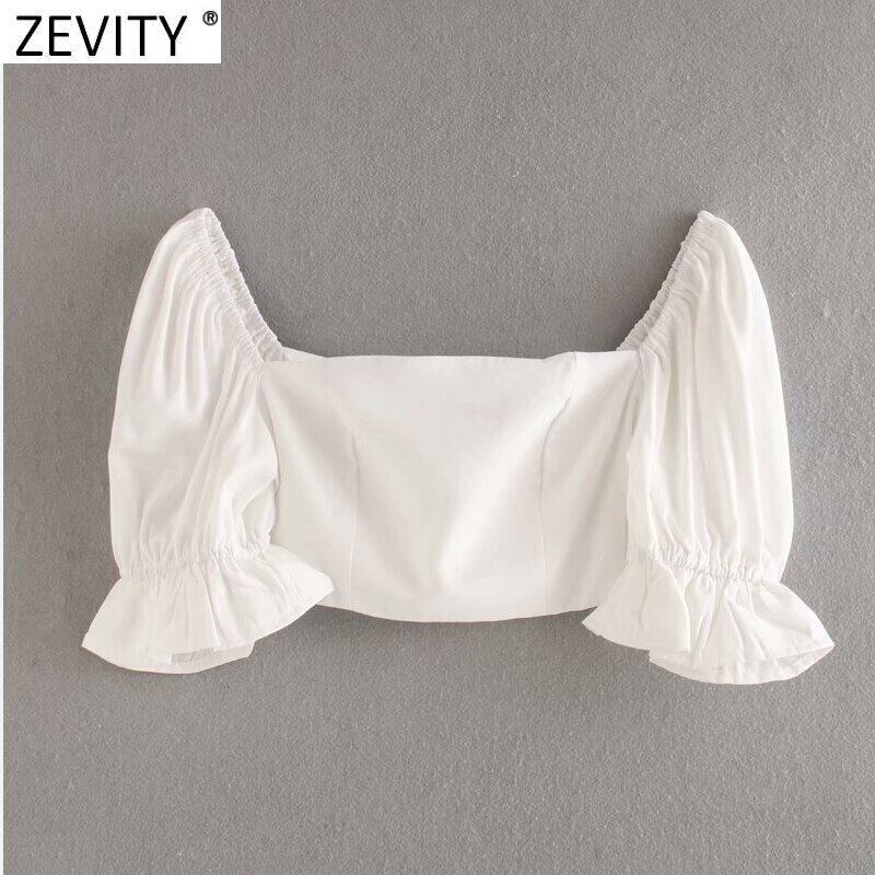 Zevityフレンチスタイルの女性無地スクエアカラーパフスリーブショートスモックブラウスレディバックジッパーシャツシックなクロップトップLS9358 Amy62392917696