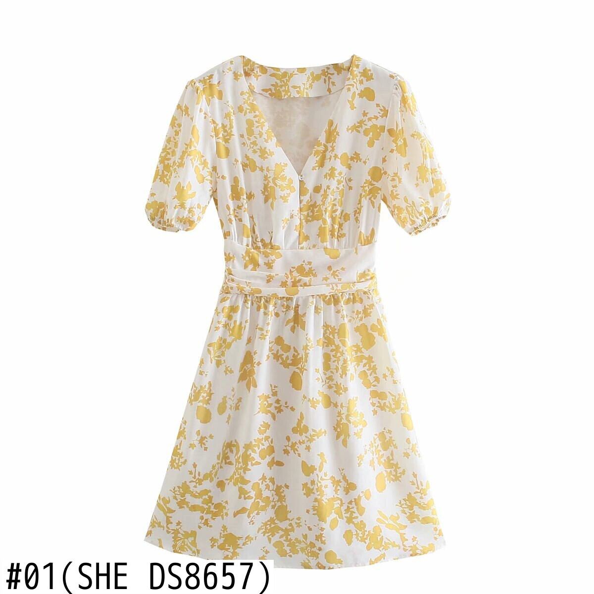 Zevity2021レディースヴィンテージVネックリーフプリントスリムミニドレスシックなパフスリーブサイドジッパー伸縮性のある Amy31028135825