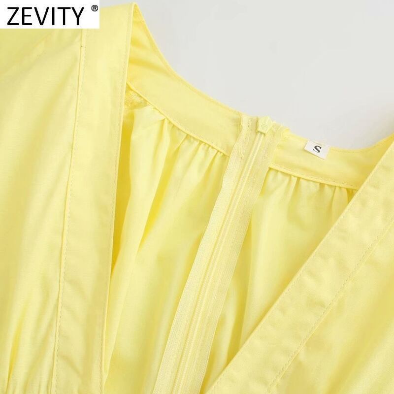 Zevity2021女性セクシーなディープVネックボウタイドイエローポプリンドレスレディランタンスリーブプリーツウエスト Amy26519373541