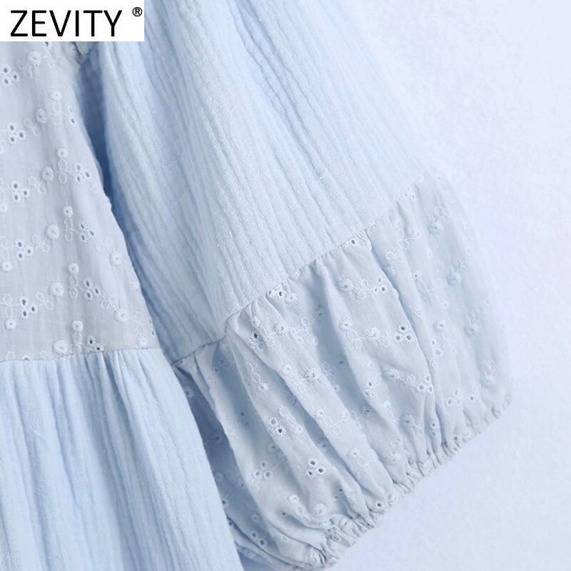 Zevity WomenOネックホローアウト刺繡パッチワークミニドレスシックなランタンスリーブプリーツ Amy65493410766