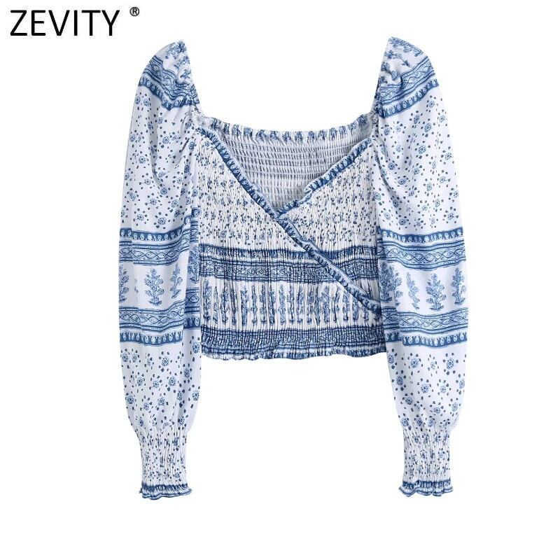 Zevity Women Vintage V Neck Patchwork Floral Print Short Shirts Elastic Pleated Slim Blouse Chic Ruffles Crop Tops LS9346 Amy82600087691