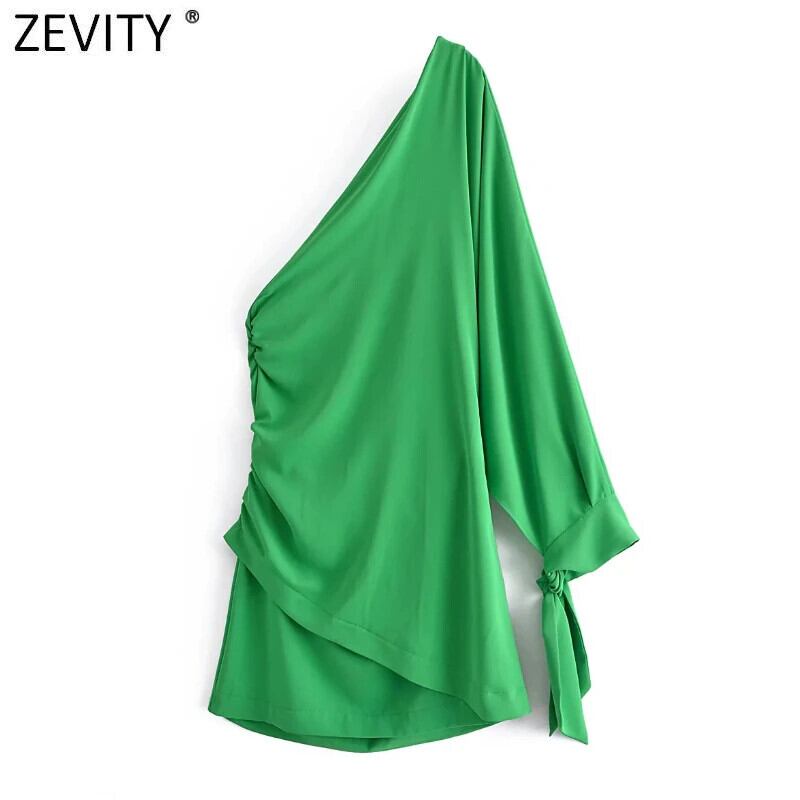 ZEVITY女性セクシーシングルショルダーグリーンカラー非対称プリーツドレスシックな不規則な裾パーティー Amy21116088192