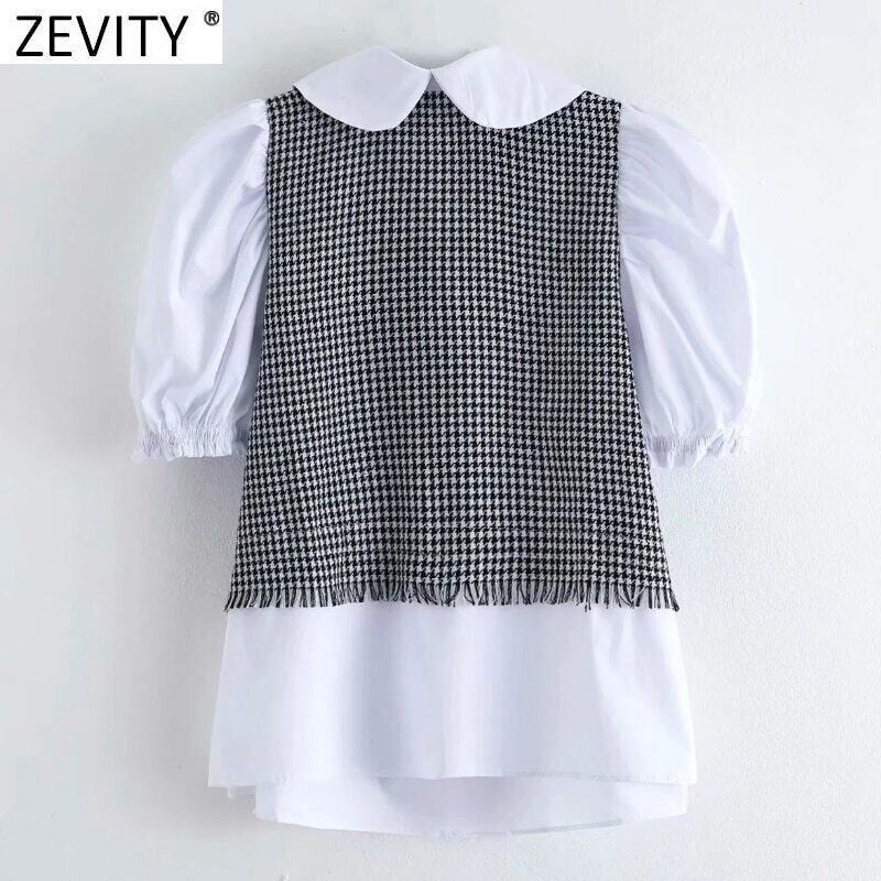 Zevity Women VintageHoundstoothツイードパッチワークホワイトポプリンブラウスパフスリーブスモックシャツシックなTelTop LS9332 Amy47886750411