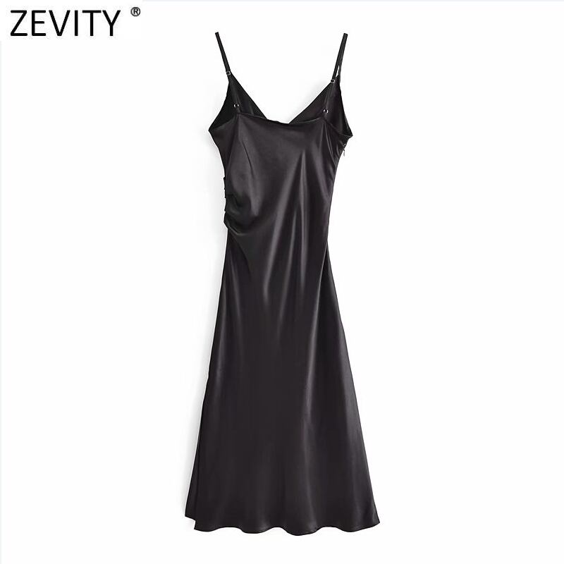 ZEVITY女性セクシークロスVネックソリッドサイドプリーツスリングミディドレスシックなスパゲッティストラップスプリットパーティー Amy63292159737