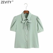 Zevity Women Sweet BowTieソリッドシャツOfficeLadyPleat半袖ブラウスRoupasシックなダイヤモンドボタンBlusaトップスLS9415 Amy1119445117