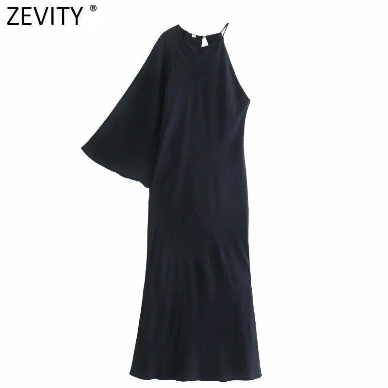 レディースアシンメトリーシングルスリーブスリムブラックミディドレス フリル ラッフル Amy89679909686