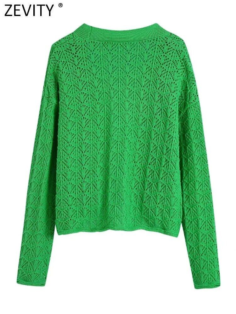 女性中空アウトグリーンカラーニットセーターシックなオープンステッチショートカーディガンコートトップスSW1112