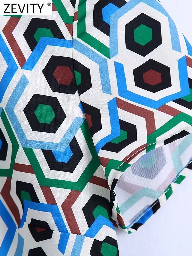 ZEVITYレディースカラーマッチング幾何学プリントレトロミニドレスオフィスレディシック半袖 ショート ハーフスリーブ 会社 学校 通勤や通学にも