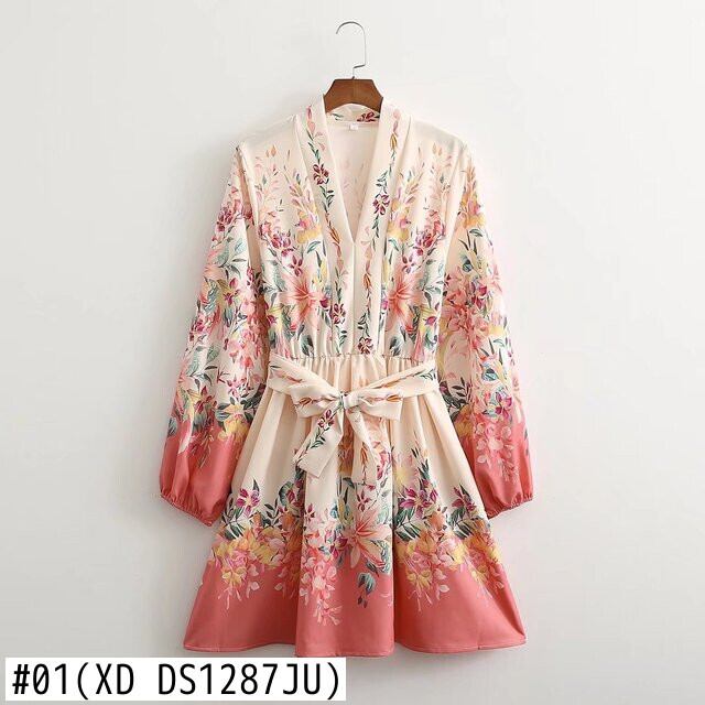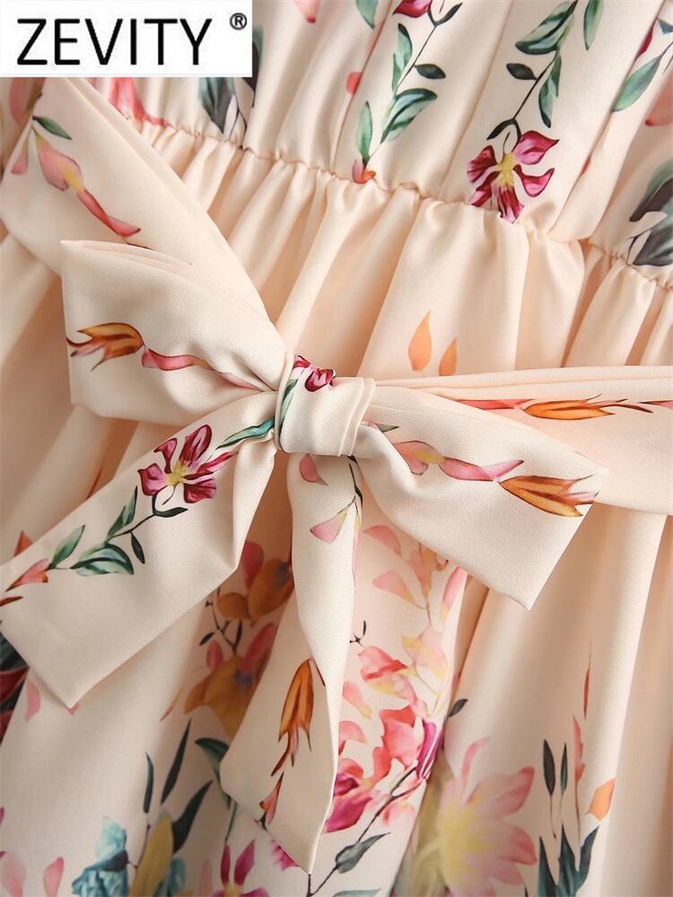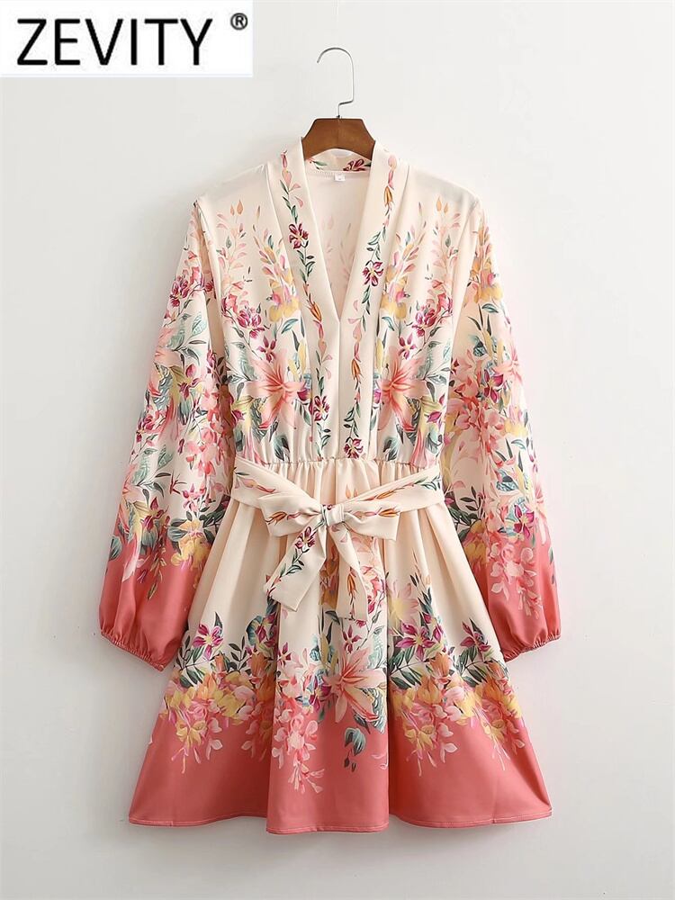 ZEVITYWomenVネックポジションフローラルプリントSahsesミニドレスシックな長袖サッシ ロング 花柄