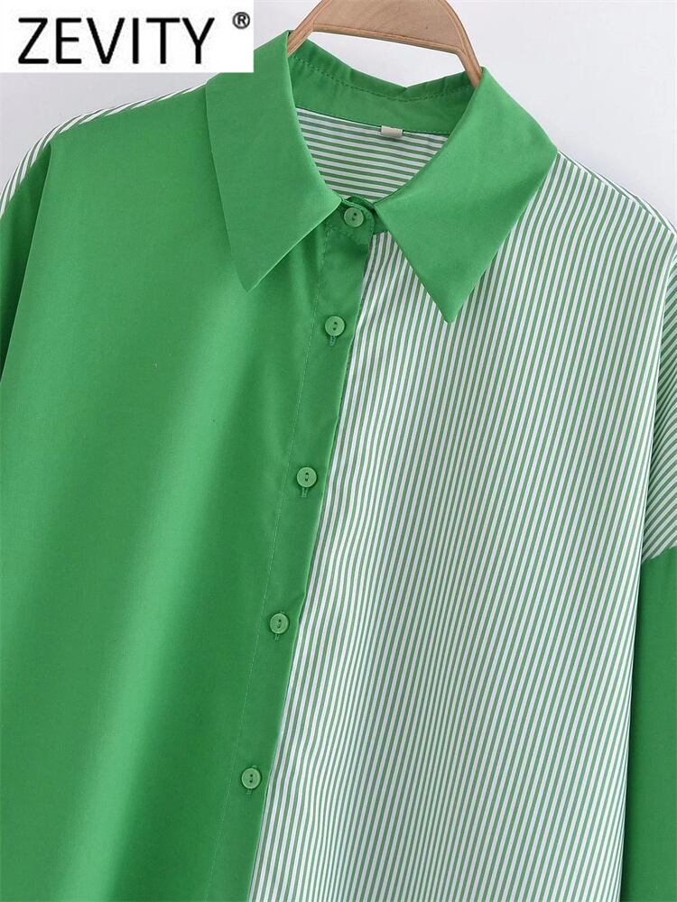 女性グリーンストライプパッチワークルーススモックブラウスシングルブレストスプリットトップスLS1398