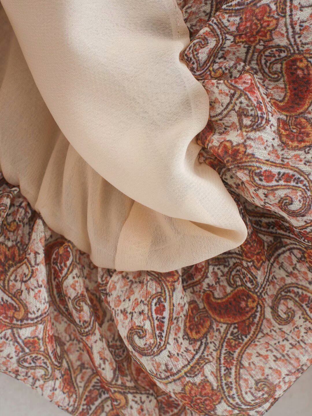 女性oネックカシューナットプリントカジュアルシフォンスモックブラウスレディースプリーツランタンスリーブシャツfemininasblusasトップスLS7213 フェミニン