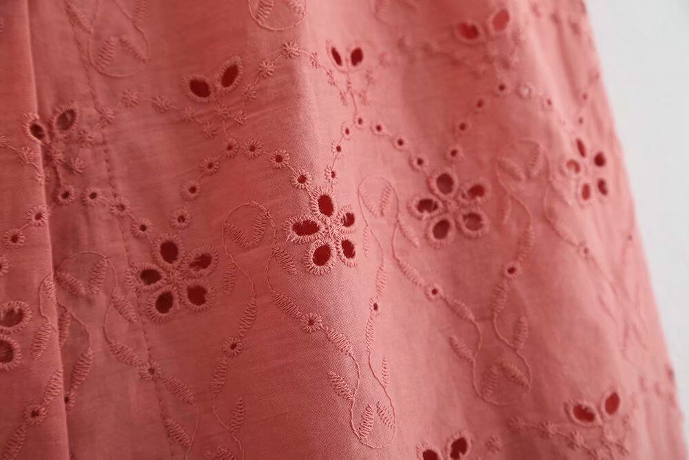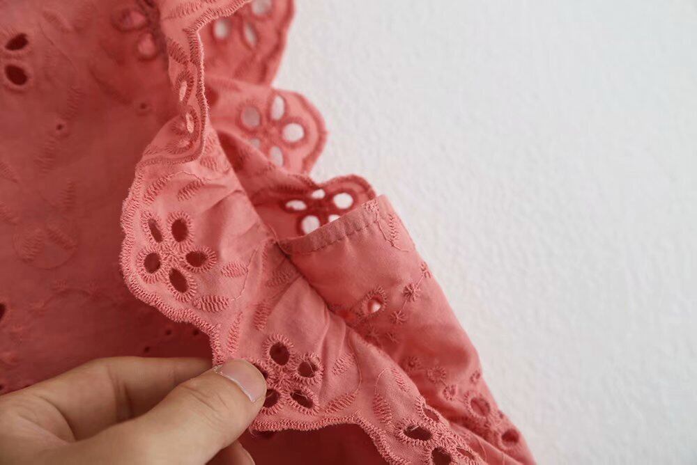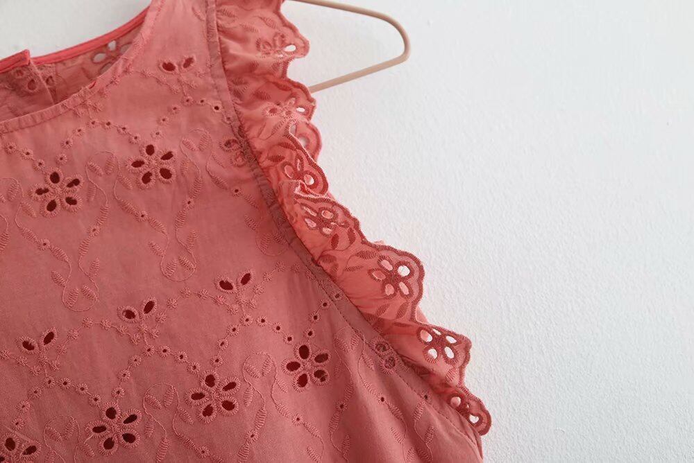 2020女性スウィートホローアウト刺繡ベストブラウスバックボタンシャツ女性oネックノースリーブフリルカジュアルブルーサトップスLS3770 ラッフル 刺繍 大人ガーリー キュート