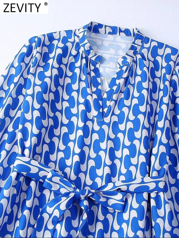 ZEVITYWomenVネック幾何学模様裾プリーツフリルミニシャツドレスシックなサッシ ラッフル