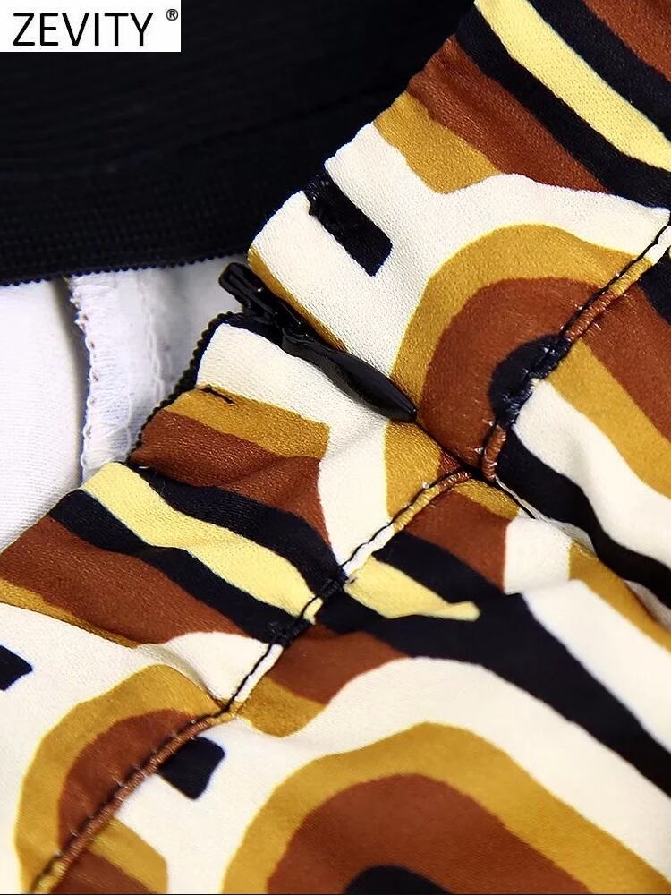女性コントラストカラー幾何学模様ジッパーフレアパンツシックな伸縮性ウエストレトロロングレングスパンツP845 エラスティック