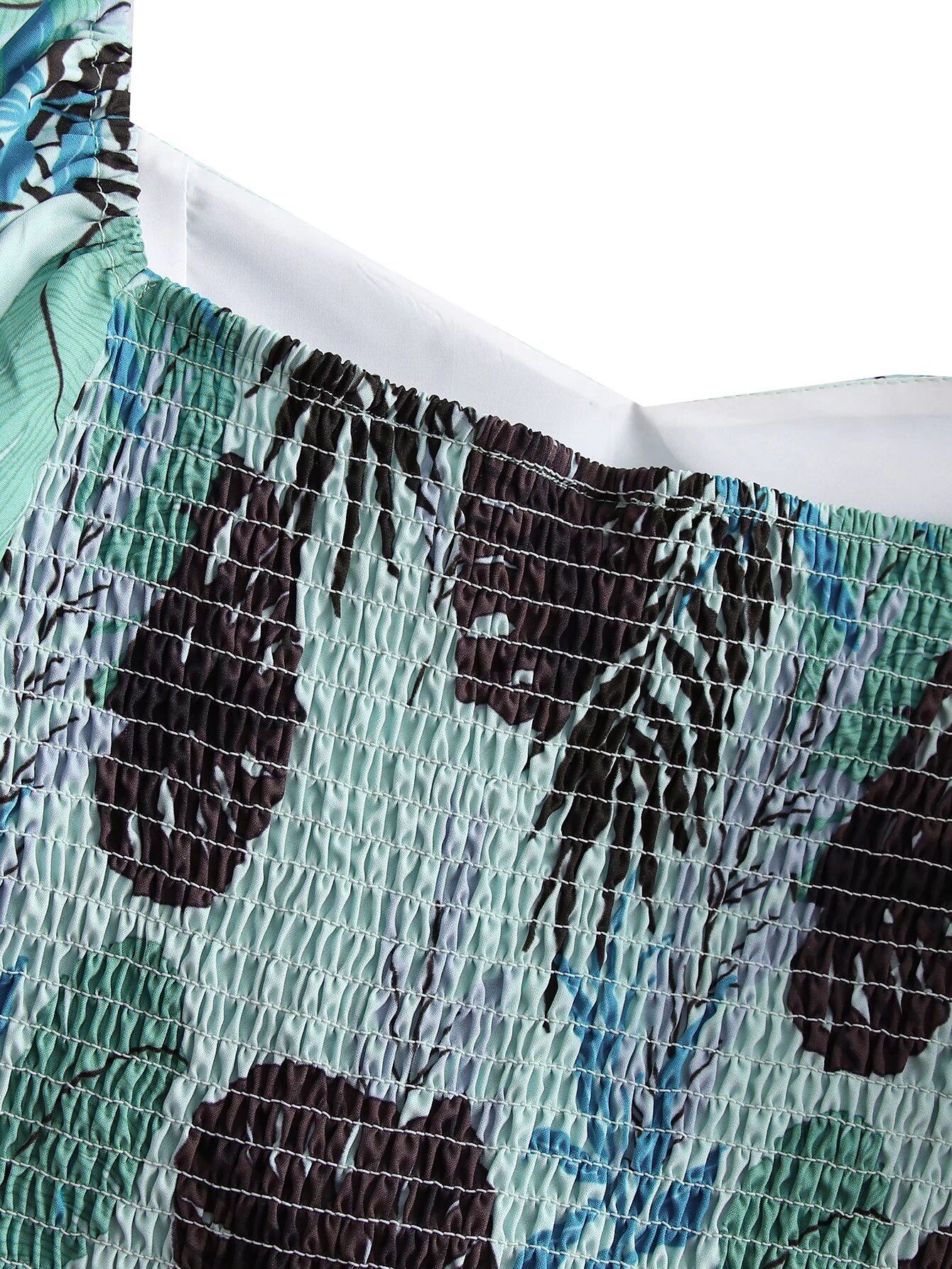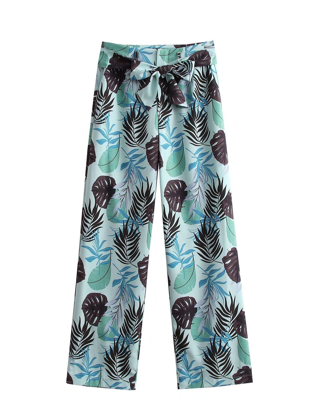 女性トロピカルリーフプリントショートクロップシャツウエストボウサッシュロングパンツツーピースセットSU101 リボン