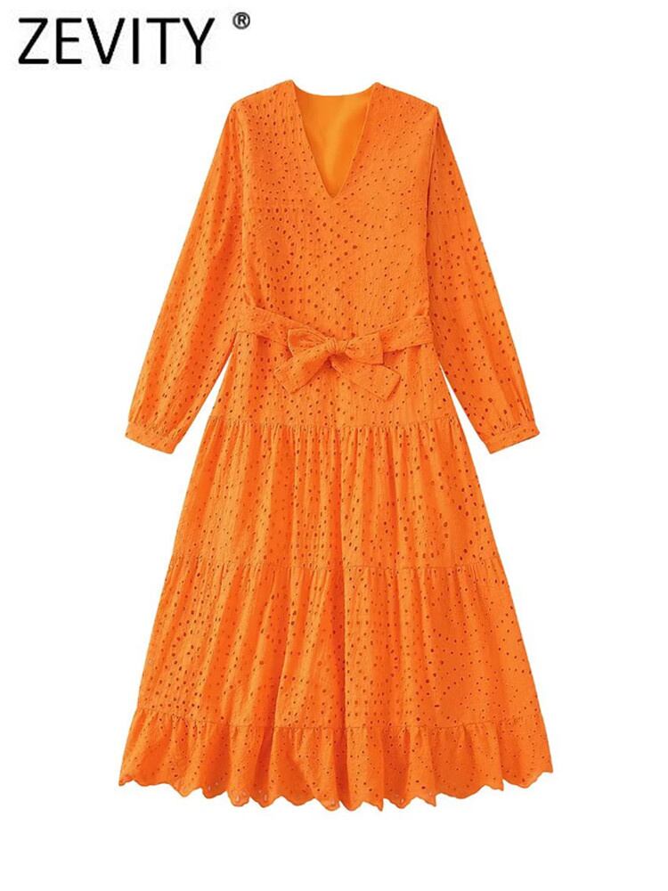 女性Vネックホローアウト刺繡スリムミディドレスシックなジッパーボウサッシュプリーツ リボン 刺繍