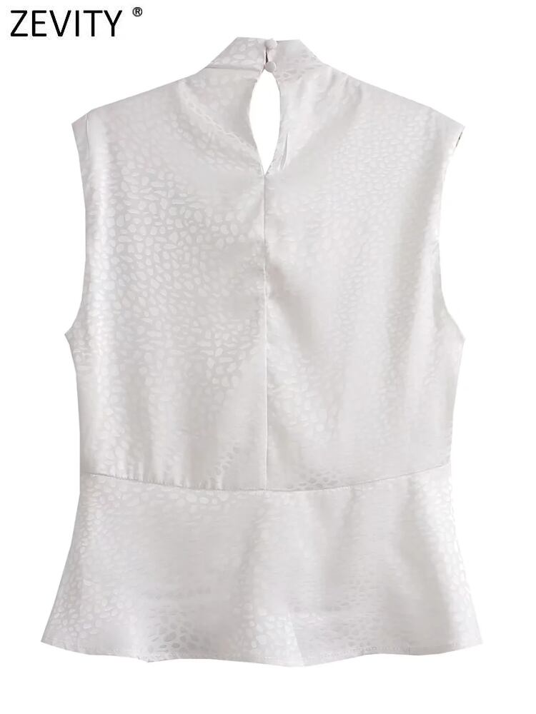 女性スタンドカラーフロントノットスリムスモックブラウスレディシックノースリーブフリルベストシャツトップス LS369 ラッフル