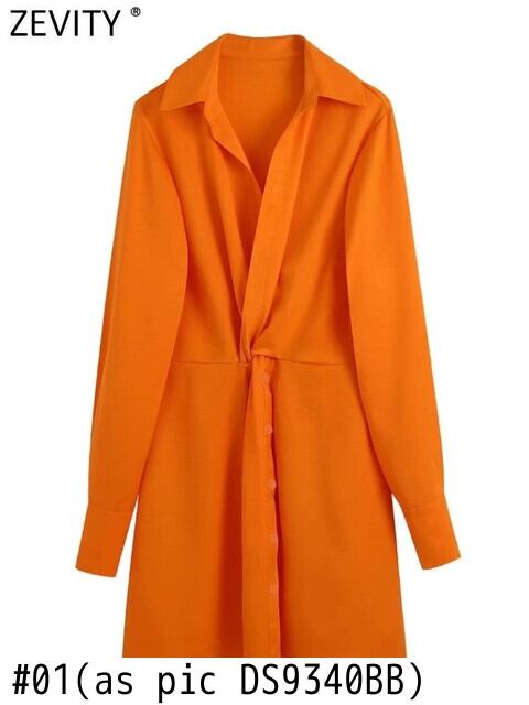 ZEVITYWomenTurnダウンカラーノットオレンジカラーミニシャツドレスシックなボタンスリム