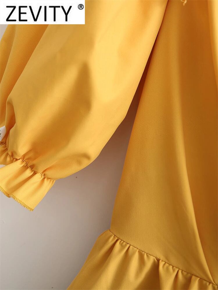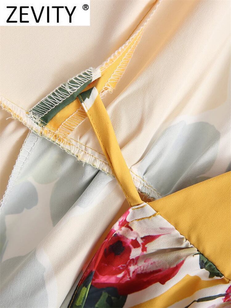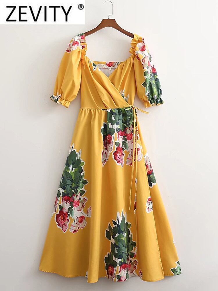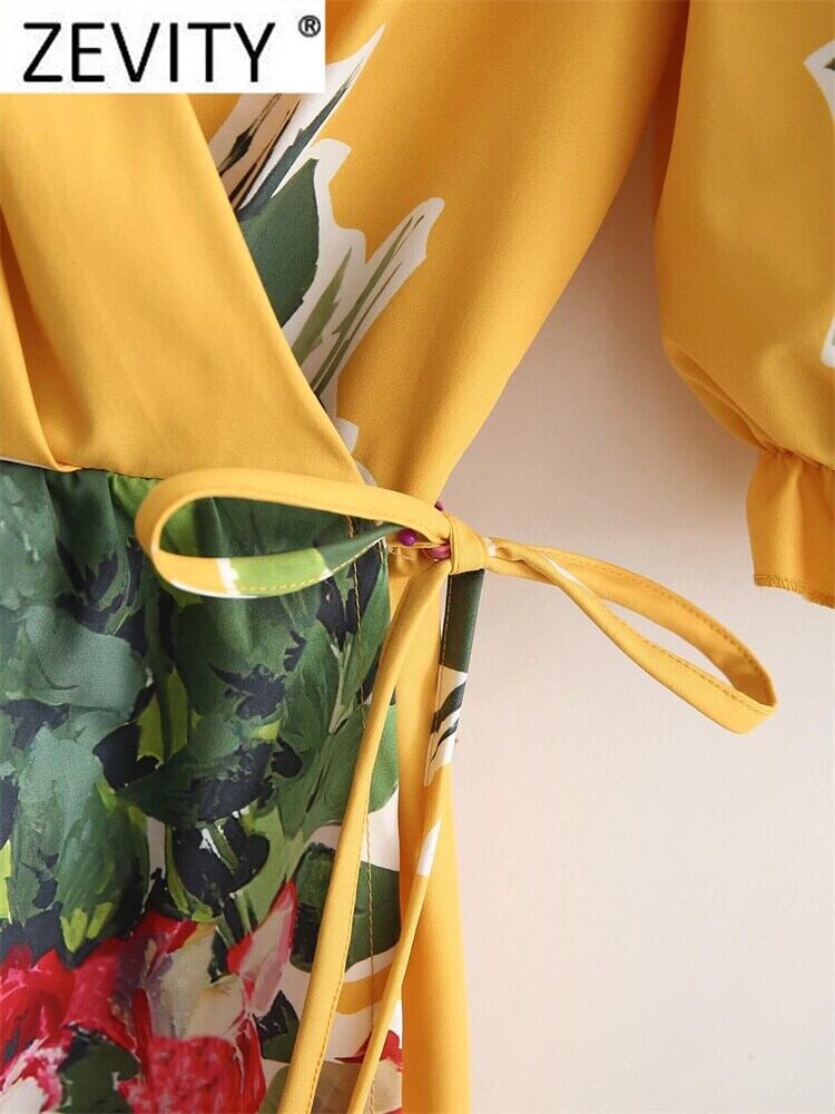 女性クロスVネックフローラルプリントスリムレースアップドレスシックなフリルイエロー ラッフル 花柄