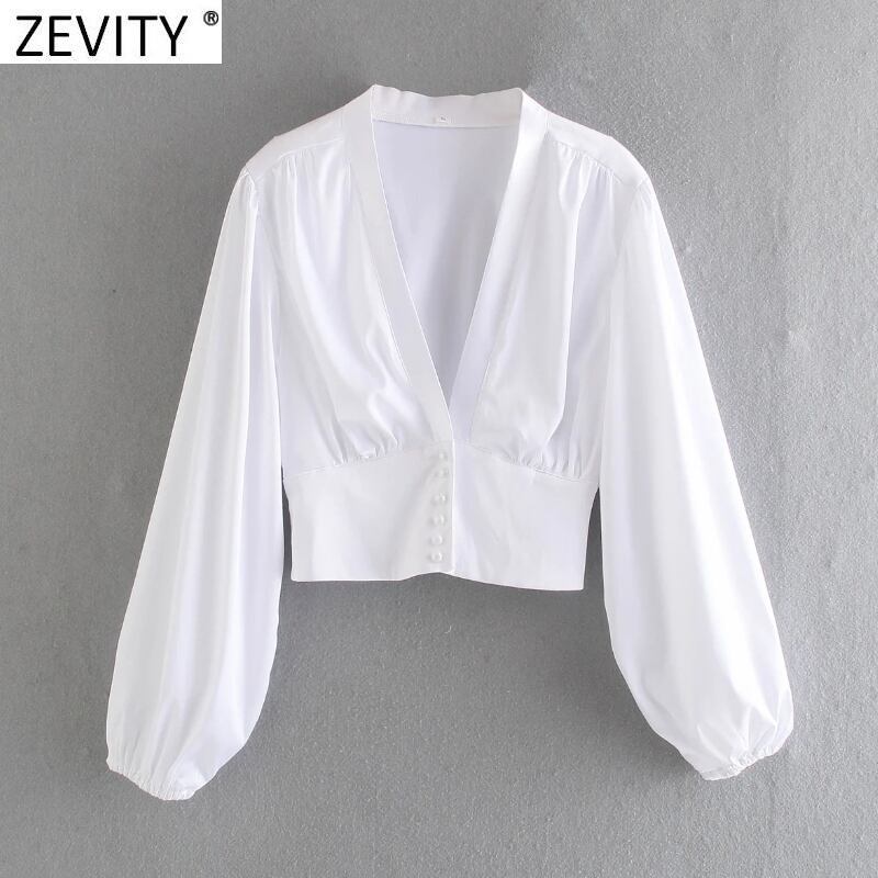 女性VネックブラックホワイトカラーショートスモックブラウスランタンスリーブスリムコートシャツシックなパールボタントップスLS9268 真珠
