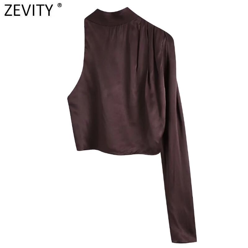 女性セクシーワンショルダーソフトサテンアシンメトリーショートスモックブラウスシックプリーツシャツクロップトップスLS9952