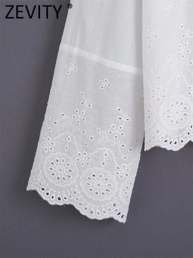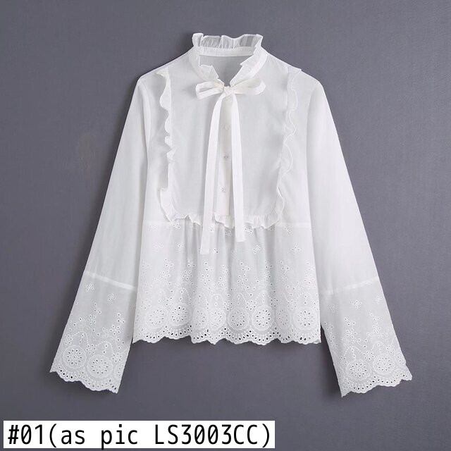 2022年女性スウィートフリルカラー裾ホローアウト刺繡ホワイトブラウスオフィスレディシャツシックボウタイトップスLS3003 リボン 刺繍 大人ガーリー キュート カジュアル 会社 学校 通勤や通学にも