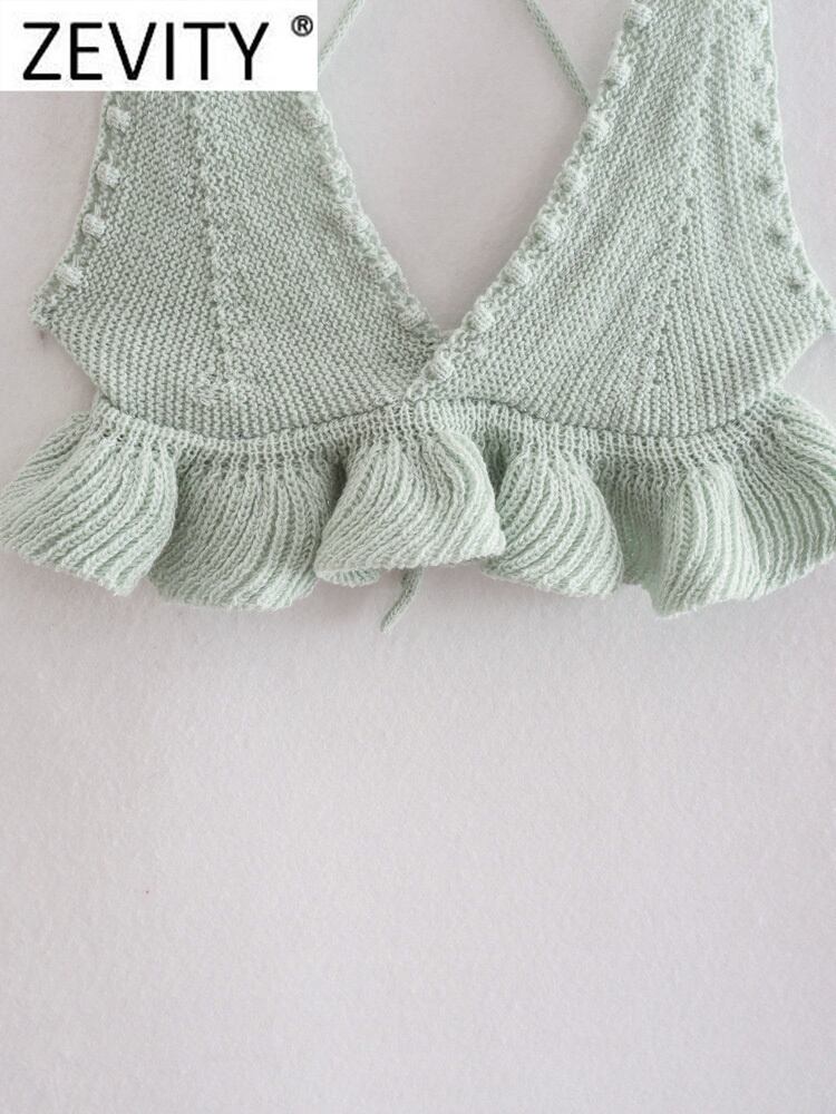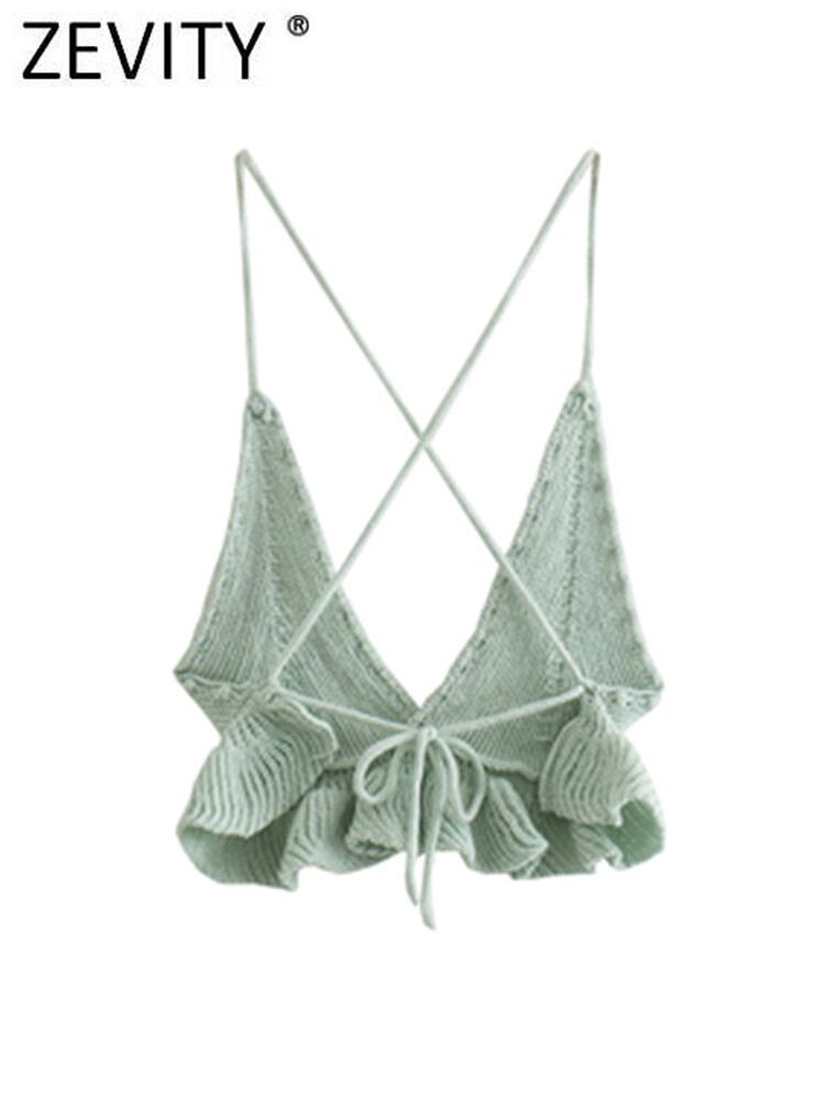 女性セクシーディープVネック裾プリーツフリル編み物スリングトップスレディシックバックレスレースアップキャミスタンクY2KクロップトップスLS1513 ラッフル