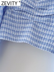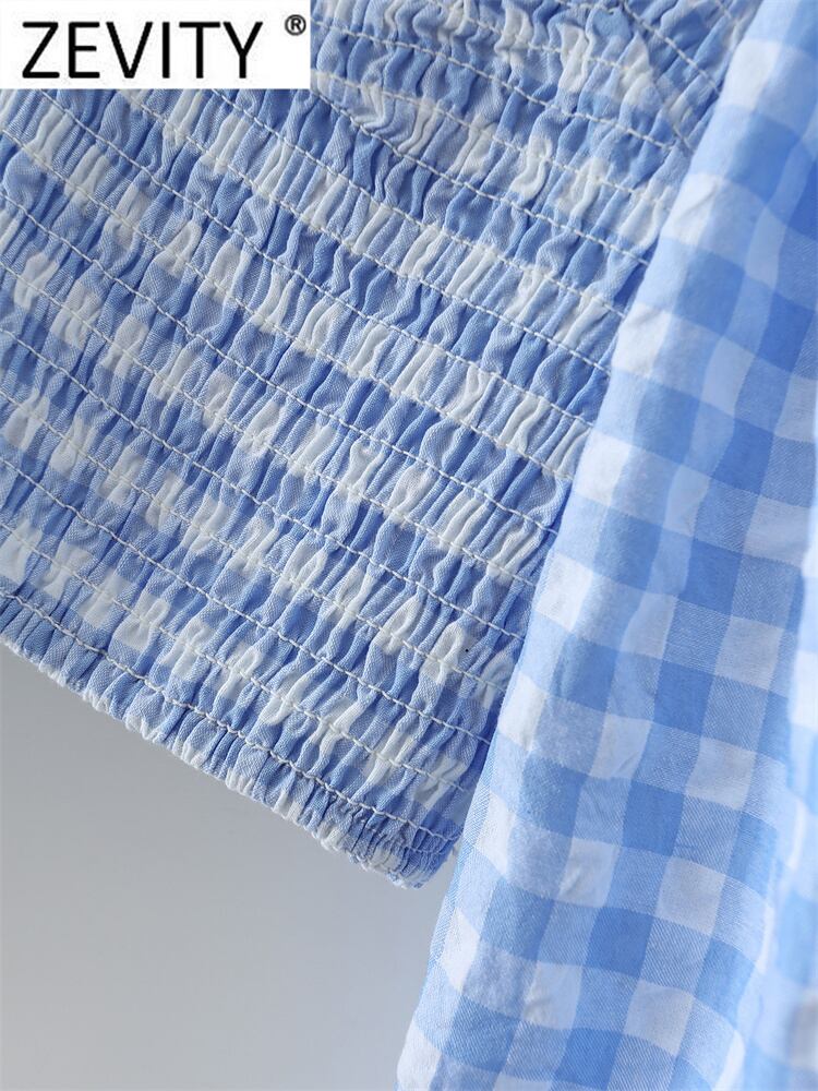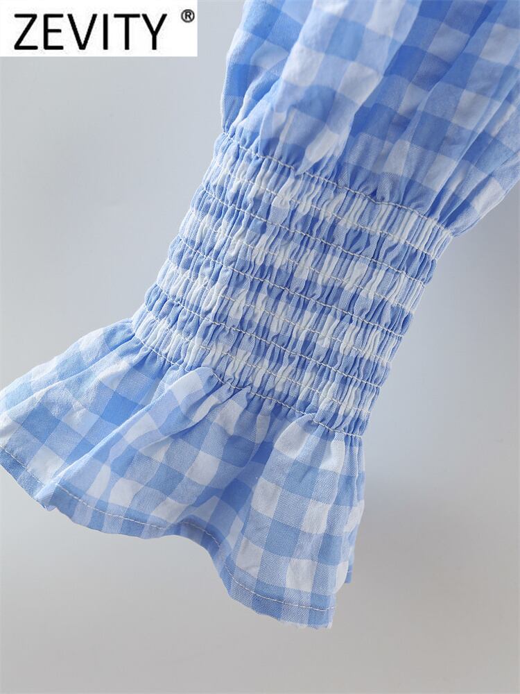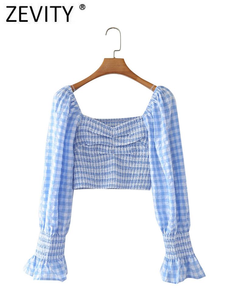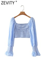 女性フレンチスタイルシュリンクプリーツチェック柄ショートスモックブラウスサマーパフスリーブスリムシャツシッククロップトップスLS814 夏物