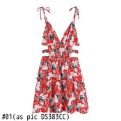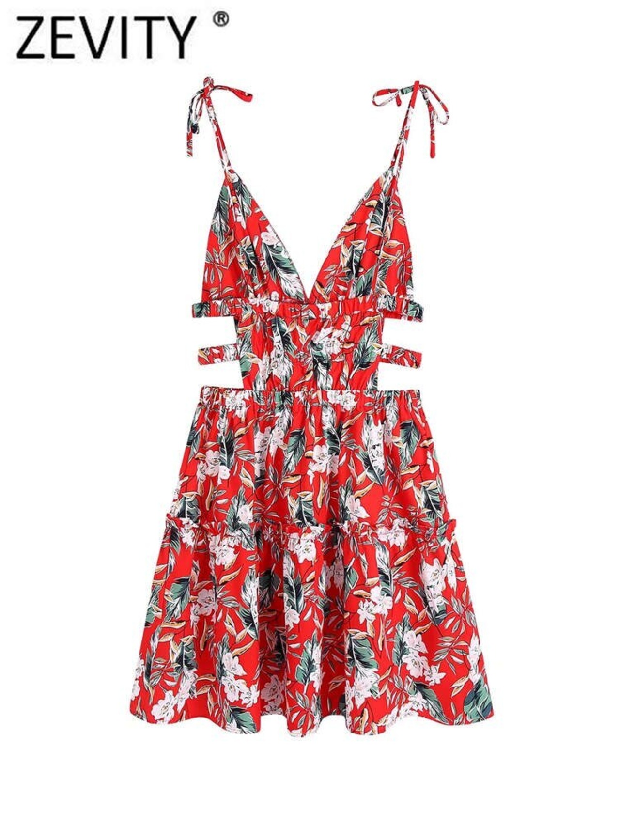 ZEVITY Women HolidayWindRedフローラルプリントレースアップストラップミニドレスシックな伸縮性中空アウトサマーフリル レッド ラッフル エラスティック 夏物 花柄