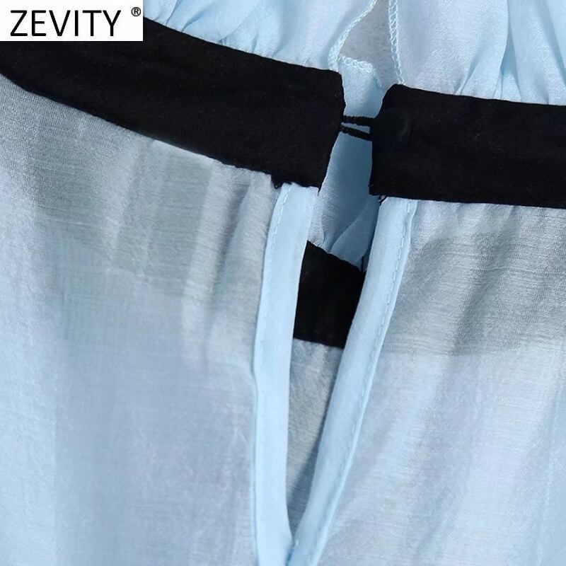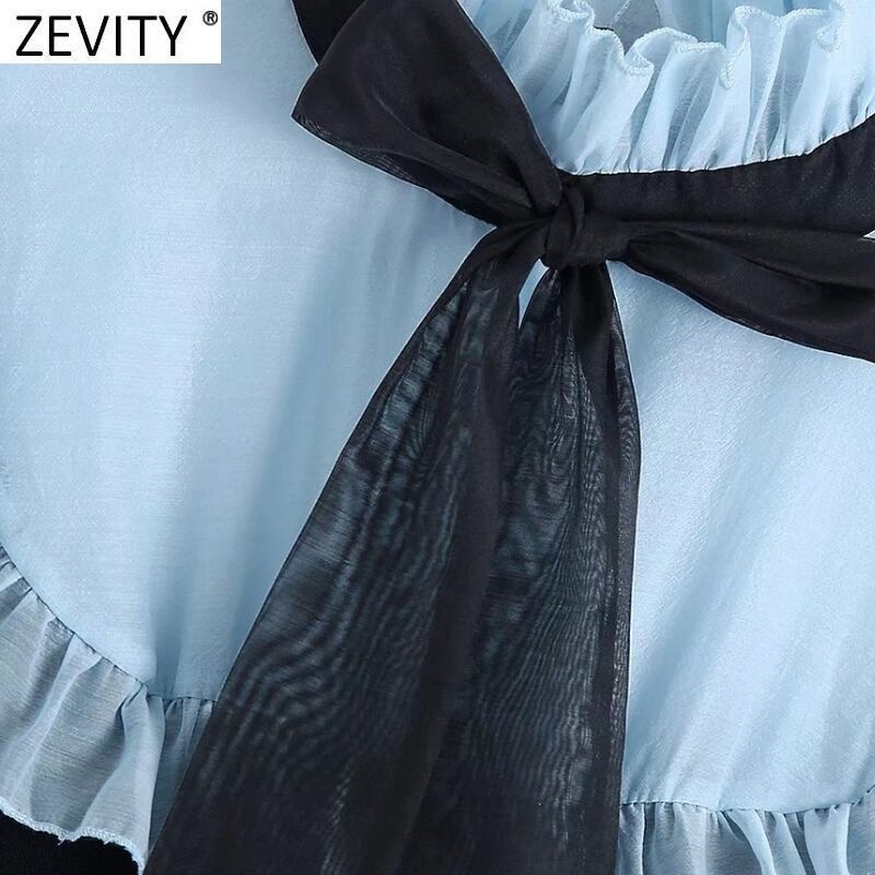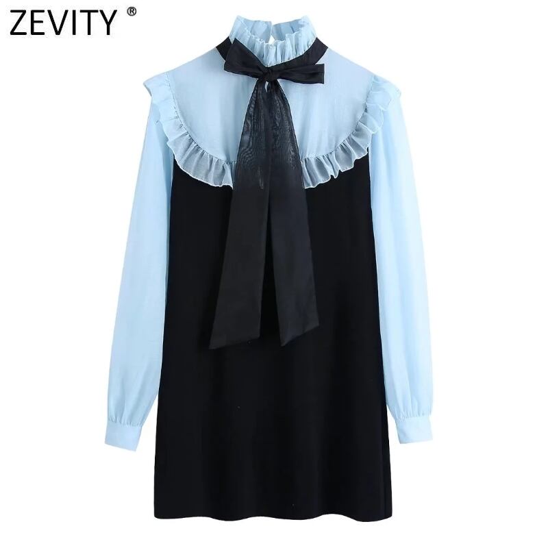 ZEVITY 女性スウィートフリルパッチワークニットミニドレス長袖蝶ネクタイスリムパーティー Vestidos DS9310 ロング リボン ラッフル 大人ガーリー キュート カジュアル