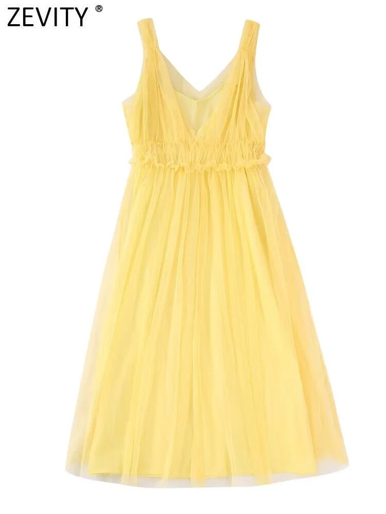 女性VネックノースリーブパッチワークメッシュヤーンイエローベストミディドレスシックバックディープVAライン