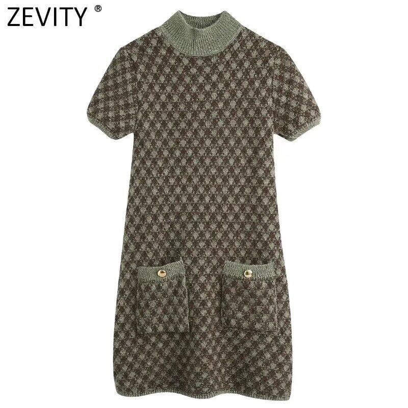 ZEVITYウィメンズスタンドカラー千鳥格子チェック柄ニットミニドレス半袖ポケット ショート ハーフスリーブ