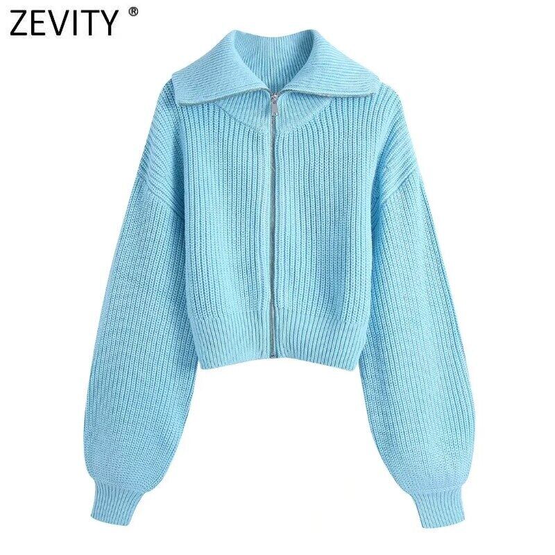 女性は襟を下げますソリッドジッパーフライニットカーディガンセーターランタンスリーブシックなコートトップスSW1033 ソリッドカラー
