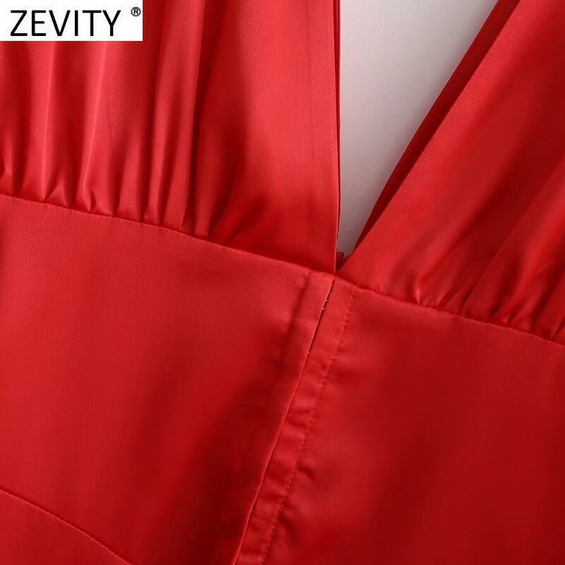 ZEVITYWomenセクシーディープVネックオーガンザパフスリーブパッチワークレッドスリムミニドレスシックバックVクラブパーティー
