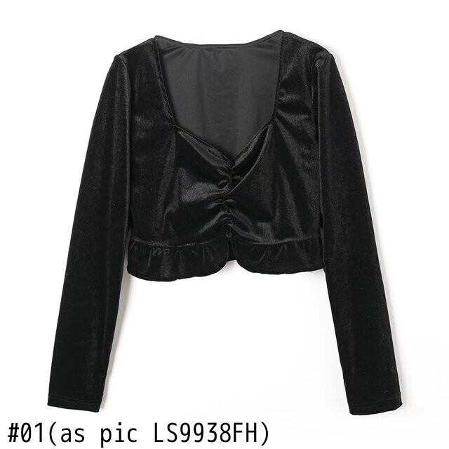女性フレンチスタイル V ネックプリーツベルベットショートブラウスレディーシックな長袖フリルシャツクロップトップス LS9938 ロング Vネック