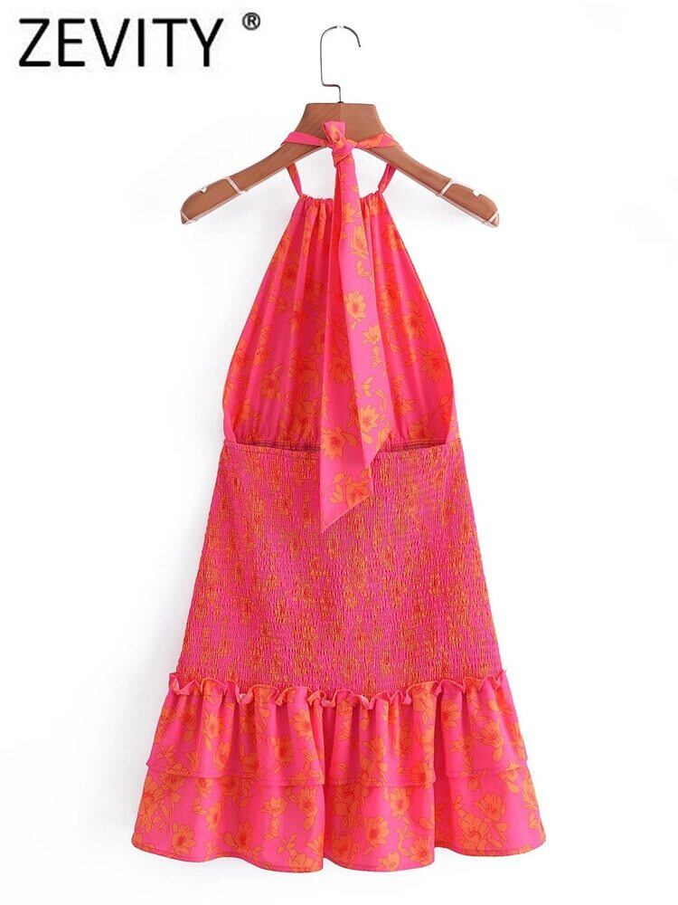 ZEVITYWomenセクシーフローラルプリントエラスティックハニカムパッチワークホルタードレスシックなバックレスフリルミニ ラッフル 伸縮 花柄