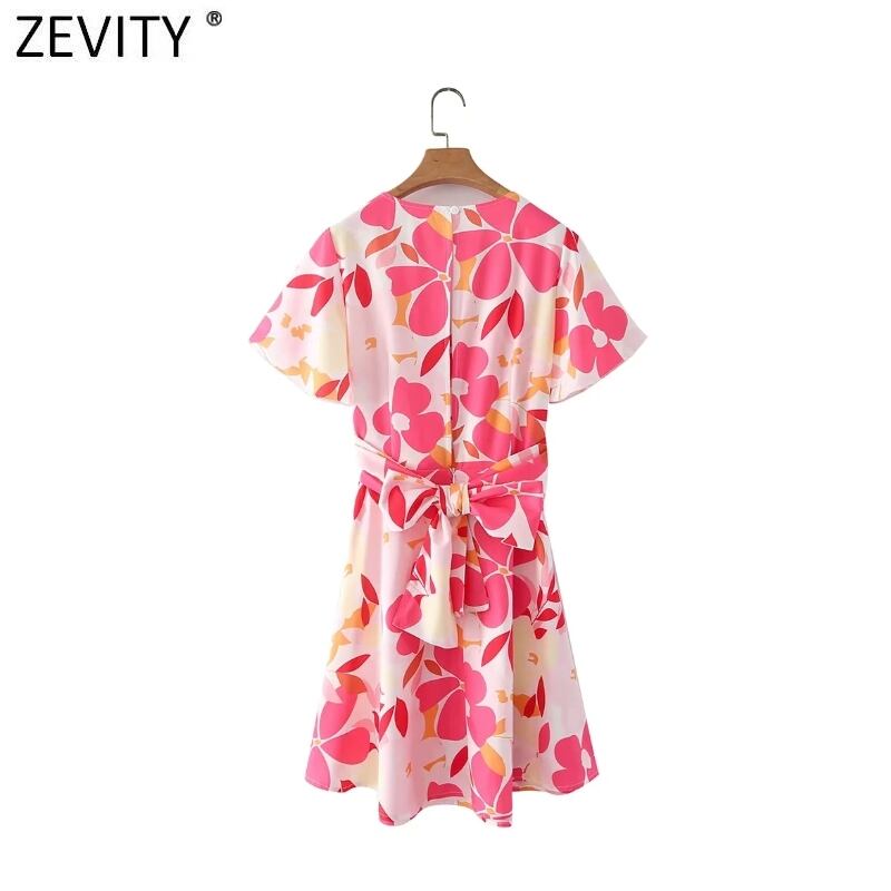ZEVITYWomenVネック半袖フローラルプリントレースアップミニドレスサマースリム ショート ハーフスリーブ 夏物 花柄