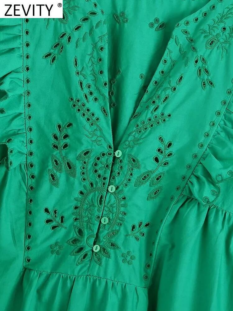 ZEVITYWomenVネックフリルホローアウト刺繡グリーンミニドレスシックなハーフスリーブ 半袖 ラッフル 刺繍