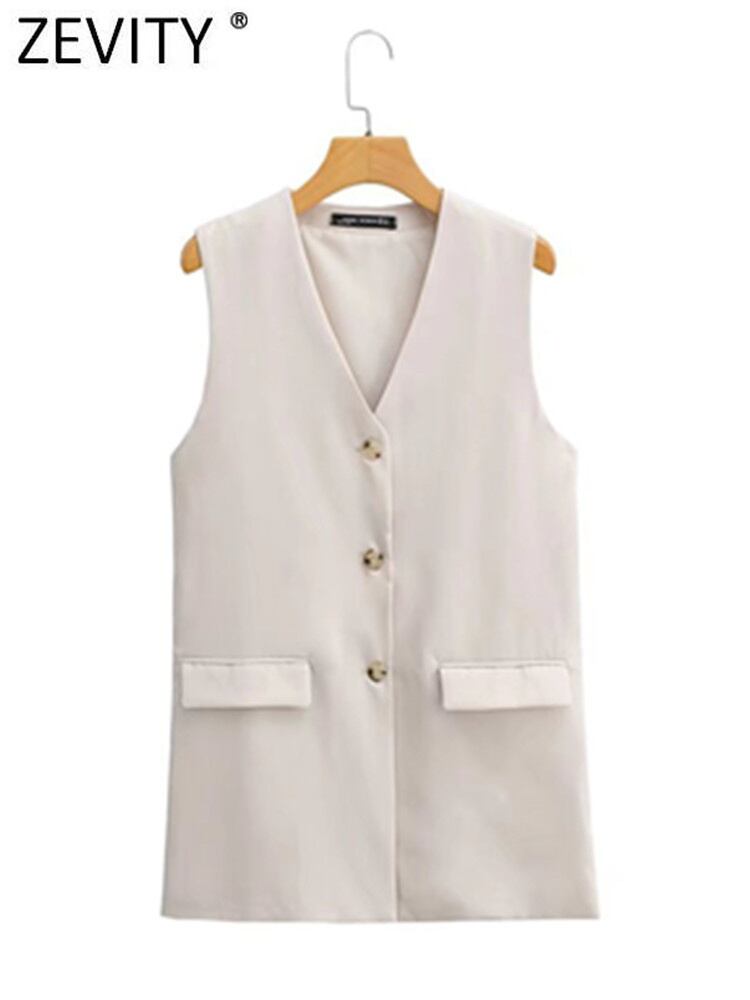 女性Vネック無地ポケットロングベストジャケットノースリーブシングルブレストチョッキトップスCT1119 ソリッドカラー