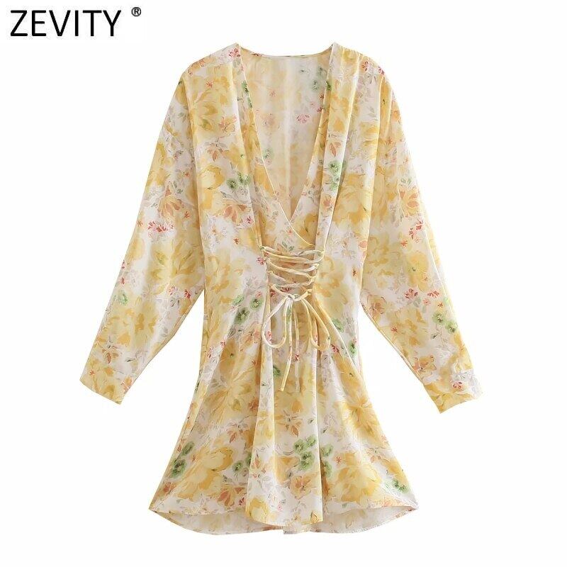 女性Vネックフローラルプリント包帯ミニドレスシックな長袖サイドジッパー ロング 花柄
