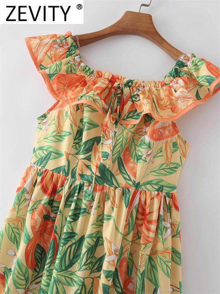 ZEVITY Women Sweet Pleat Ruffles Contrast Color Leaves Print Summer Midi Dress Chic Patchwork Bohemian Vestidos DS820 フリル ラッフル 大人ガーリー スウィート キュート カジュアル サマー 夏物