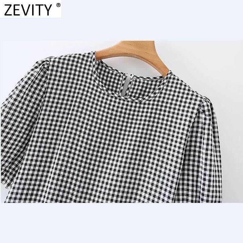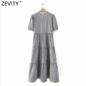 2021年女性Oネックパフスリーブチェック柄プリントプリーツミディドレスシックなフリルAライン ラッフル