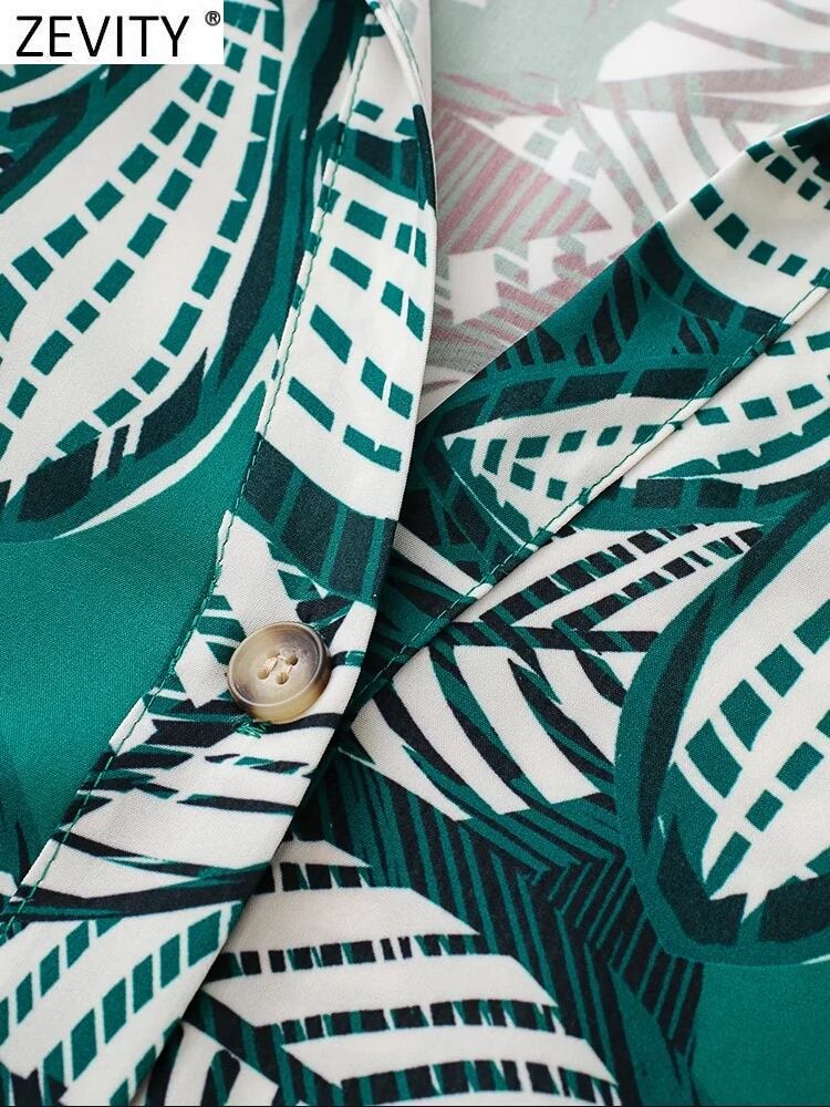 女性の緑の葉プリントシングルブレストミディシャツドレスシックなボウサッシュビジネス リボン グリーン