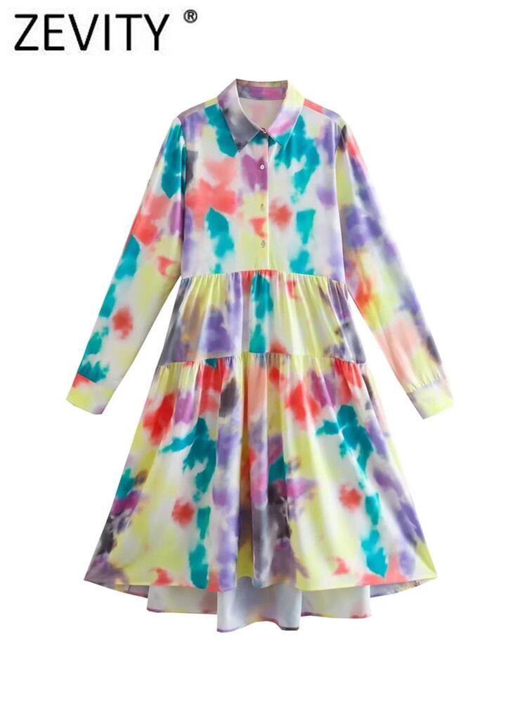 女性カラフルな絞り染めプリントウエストシャツミディドレスオフィスレディシックビッグスイング 会社 学校 通勤や通学にも