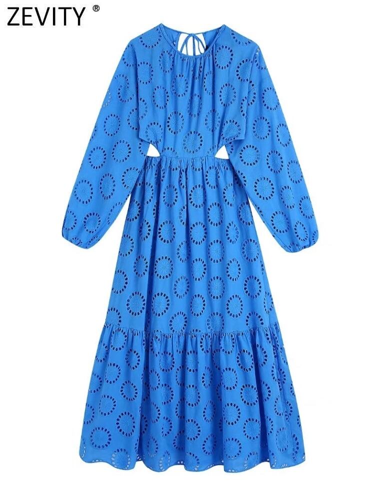 女性Oネック長袖プリーツフリルミディドレスレディシックフローラル刺繡中空アウトバックレス ロング ラッフル 刺繍 花柄