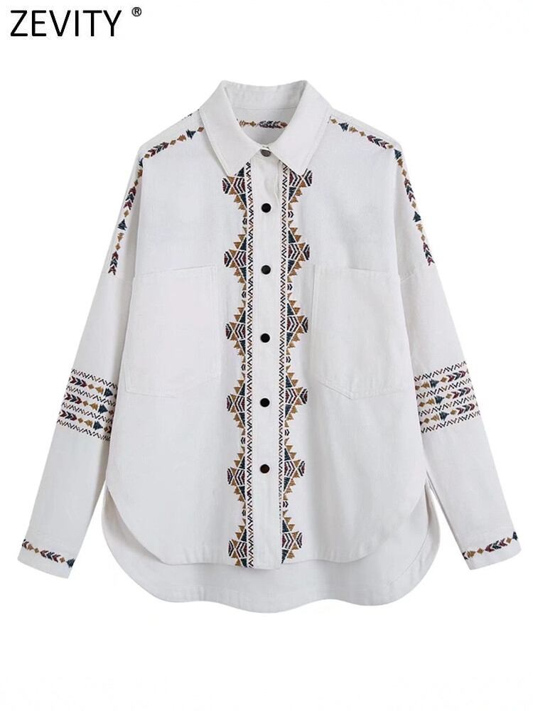 2022 女性幾何刺繍ブラウスオフィスレディダブルポケットパッチシャツシックなトップス LS3020 会社 学校 通勤や通学にも