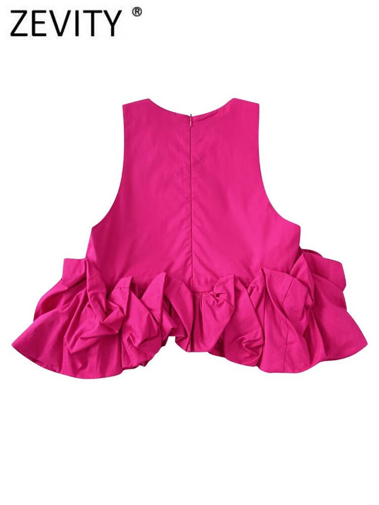 女性Oネックノースリーブ裾プリーツフリルショートスモックブラウス非対称シャツシックなジッパートップスLS1543 ラッフル