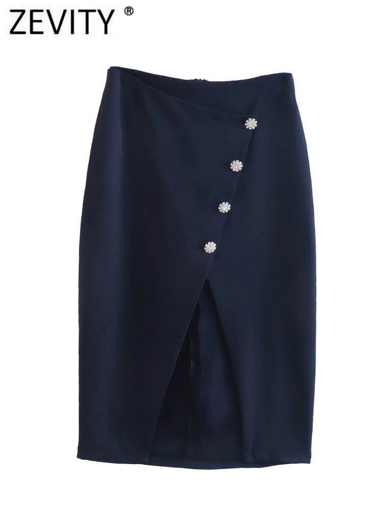 女性のダイヤモンドボタンスプリット不規則なスリムミドルスカートファルダスバックジッパーAライン